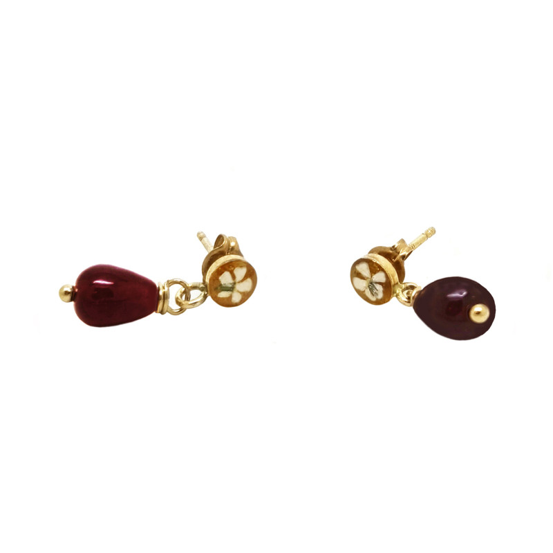 Boucles d'oreilles de la gamme florale réalisées à partir d’éléments en or gold filled 14k, d'agates fuchsias et ornées de pétales de jasmin d'hiver et de torilis des champs cueillis à la main en Provence par Angélique, la créatrice. Les compositions présentent dans ses bijoux sont naturelles et varient au fil des saisons, à l'allure des floraisons et selon ses cueillettes. Elles sont pétiolées, sessiles, entières, parfois dentées à nervures pennées ou palmées avec un certain nombre de nœuds, et sont triées, puis sélectionnées et reposées pendant plusieurs jours avant de prendre forme dans son atelier-boutique à Aix-en-Provence (13290). Pièce anti-allergène. Hauteur : 18 mm. Largeur : 4 mm. Entretien : ne craint pas l'eau.