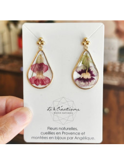 Boucles d'oreilles de la gamme florale réalisées à partir d'éléments en or gold filled 14k, et ornées de pensées cueillies à la main en Provence par Angélique, la créatrice. Les compositions présentent dans ses bijoux sont naturelles et varient au fil des saisons, à l'allure des floraisons et selon ses cueillettes. Elles sont pétiolées, sessiles, entières, parfois dentées à nervures pennées ou palmées avec un certain nombre de nœuds, et sont triées, puis sélectionnées et reposées pendant plusieurs jours avant de prendre forme dans son atelier-boutique à Aix-en-Provence (13290). Cette paire de boucles d'oreilles a la particularité de ne révéler qu'un seul exemplaire. Hauteur : 40 mm. Largeur : 20 mm. Pièce anti-allergène. Entretien : ne craint pas l'eau.
