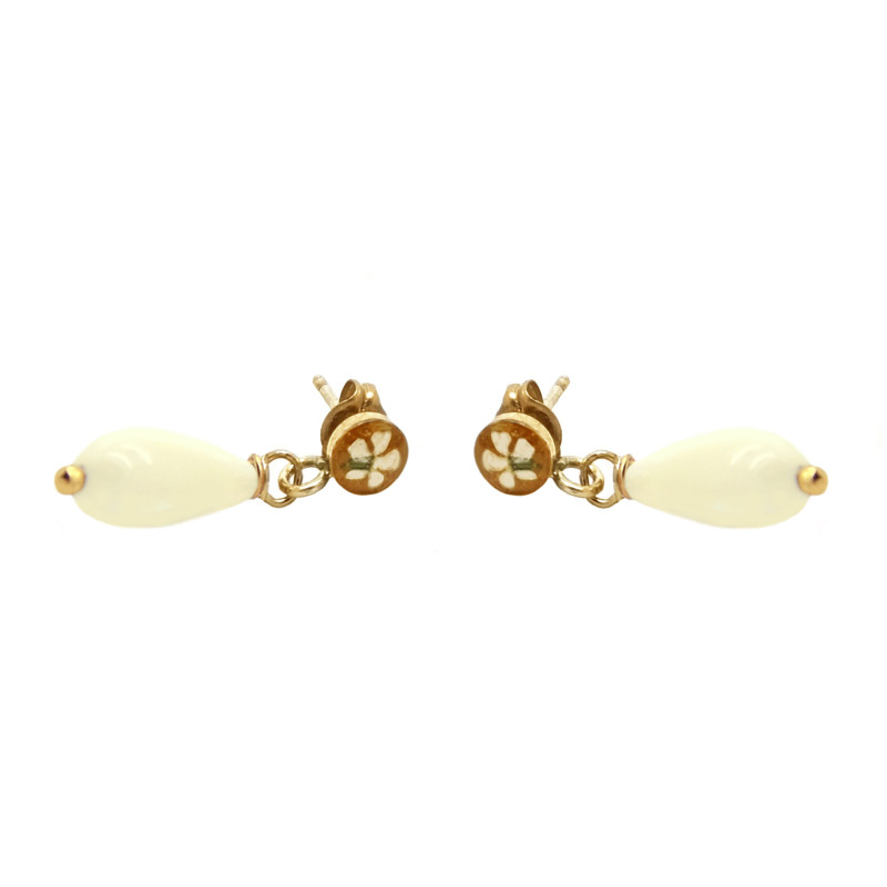 Boucles d'oreilles de la gamme florale réalisées à partir d’éléments en or gold filled 14k, de nacres naturelles et ornées de pétales de jasmin d'hiver et de torilis des champs cueillis en Provence par Angélique, la créatrice. Les fleurs présentent dans ses bijoux sont naturelles et varient au fil des saisons, à l'allure des floraisons et selon ses récoltes. Elles sont pétiolées, sessiles, entières, parfois dentées à nervures pennées ou palmées avec un certain nombre de nœuds, et sont triées, puis sélectionnées et reposées pendant plusieurs jours dans son atelier-boutique à Aix-en-Provence (13290) avant de prendre forme entre ses mains.Pièce anti -allergène. Hauteur : 19 mm. Largeur : 4 mm. Entretien : ne craint pas l'eau.