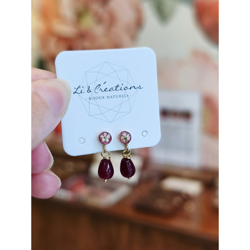 Boucles d'oreilles de la gamme florale réalisées à partir d’éléments en or gold filled 14k, d'agates fuchsias et ornées de pétales de pivoine et de torilis des champs cueillis à la main en Provence par Angélique, la créatrice. Les compositions présentent dans ses bijoux sont naturelles et varient au fil des saisons, à l'allure des floraisons et selon ses cueillettes. Elles sont pétiolées, sessiles, entières, parfois dentées à nervures pennées ou palmées avec un certain nombre de nœuds, et sont triées, puis sélectionnées et reposées pendant plusieurs jours avant de prendre forme dans son atelier-boutique à Aix-en-Provence (13290). Pièce anti-allergène. Hauteur : 18 mm. Largeur : 4 mm. Entretien : ne craint pas l'eau.