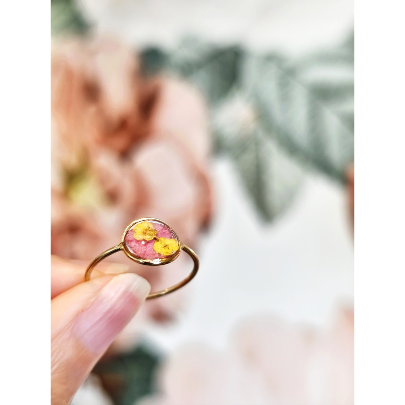 Bague de la gamme florale, réalisée à partir d'un support en or gold filled 14k et ornée de pétales de rose rose et de fleurs jaunes cueillis à la main en Provence par Angélique, la créatrice. Les compositions présentent dans ses bijoux sont naturelles et varient au fil des saisons, à l'allure des floraisons et selon ses cueillettes. Elles sont pétiolées, sessiles, entières, parfois dentées à nervures pennées ou palmées avec un certain nombre de nœuds, et sont triées, puis sélectionnées et reposées pendant plusieurs jours avant de prendre forme dans son atelier-boutique à Aix-en-Provence (13290).