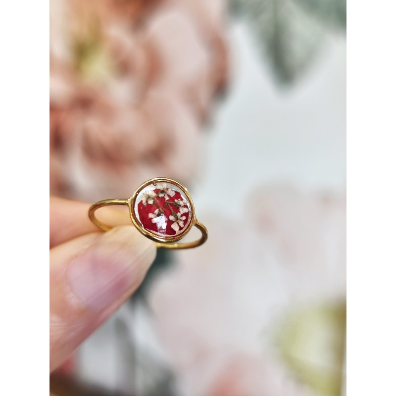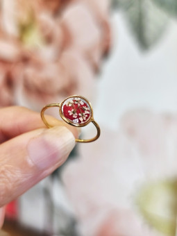 Bague de la gamme florale, réalisée à partir d'un support en or gold filled 14k et ornée d'une pétale de rose et de torilis des champs cueillis à la main en Provence par Angélique, la créatrice. Les compositions présentent dans ses bijoux sont naturelles et varient au fil des saisons, à l'allure des floraisons et selon ses cueillettes. Elles sont pétiolées, sessiles, entières, parfois dentées à nervures pennées ou palmées avec un certain nombre de nœuds, et sont triées, puis sélectionnées et reposées pendant plusieurs jours avant de prendre forme dans son atelier-boutique à Aix-en-Provence (13290).