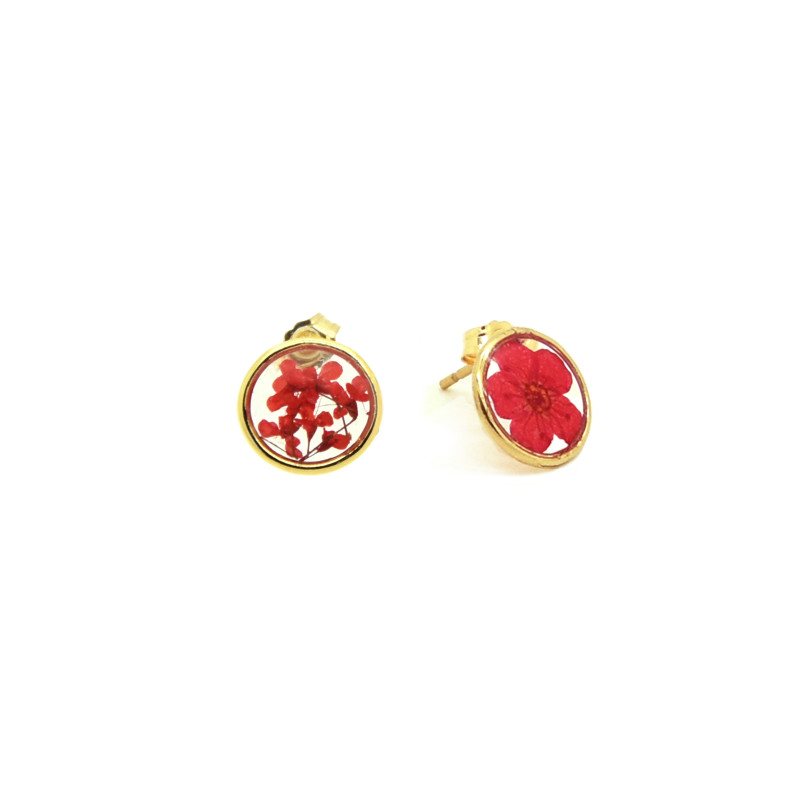 Boucles d'oreilles clous de la gamme florale, réalisées à partir d’éléments disponibles en or gold filled 14k, et ornées d'une fleur de spirée rouge et de torilis des champs cueillis à la main en Provence par Angélique, la créatrice. Les compositions présentent dans ses bijoux sont naturelles et varient au fil des saisons, à l'allure des floraisons et selon ses cueillettes. Elles sont pétiolées, sessiles, entières, parfois dentées à nervures pennées ou palmées avec un certain nombre de nœuds, et sont triées, puis sélectionnées et reposées pendant plusieurs jours avant de prendre forme dans son atelier-boutique à Aix-en-Provence (13290). Cette paire de boucles d'oreilles a la particularité de ne révéler qu'un seul exemplaire. Pièce anti-allergène. Diamètre : 10 mm. Entretien : ne craint pas l'eau.
