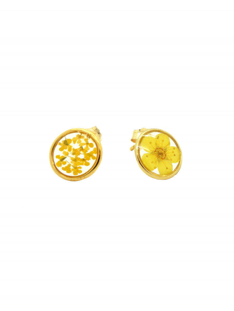 Boucles d'oreilles clous de la gamme florale, réalisées à partir d’éléments disponibles en or gold filled 14k, et ornées d'une fleur de spirée jaune et de torilis des champs cueillis à la main en Provence par Angélique, la créatrice. Les compositions présentent dans ses bijoux sont naturelles et varient au fil des saisons, à l'allure des floraisons et selon ses cueillettes. Elles sont pétiolées, sessiles, entières, parfois dentées à nervures pennées ou palmées avec un certain nombre de nœuds, et sont triées, puis sélectionnées et reposées pendant plusieurs jours avant de prendre forme dans son atelier-boutique à Aix-en-Provence (13290). Cette paire de boucles d'oreilles a la particularité de ne révéler qu'un seul exemplaire. Pièce anti-allergène. Diamètre : 10 mm. Entretien : ne craint pas l'eau.