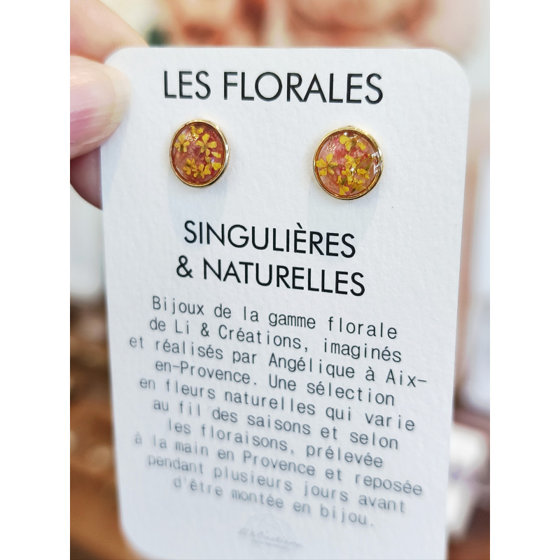 Boucles d'oreilles clous de la gamme florale réalisées à partir d’éléments en or gold filled 14k et ornées de pétales de rose et de torilis des champs cueillis à la main en Provence par Angélique, la créatrice. Les compositions présentent dans ses bijoux sont naturelles et varient au fil des saisons, à l'allure des floraisons et selon ses cueillettes. Elles sont pétiolées, sessiles, entières, parfois dentées à nervures pennées ou palmées avec un certain nombre de nœuds, et sont triées, puis sélectionnées et reposées pendant plusieurs jours avant de prendre forme dans son atelier-boutique à Aix-en-Provence (13290). Pièce anti-allergène. Diamètre : 10 mm. Entretien : ne craint pas l'eau.