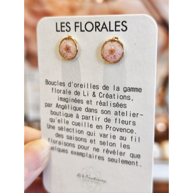Boucles d'oreilles clous de la gamme florale, réalisées à partir d'un support en or gold filled 14k et ornées de fleurs de spirée coloris rose nude cueillies à la main en Provence par Angélique, la créatrice. Les compositions présentent dans ses bijoux sont naturelles et varient au fil des saisons, à l'allure des floraisons et selon ses cueillettes. Elles sont pétiolées, sessiles, entières, parfois dentées à nervures pennées ou palmées avec un certain nombre de nœuds, et sont triées, puis sélectionnées et reposées pendant plusieurs jours avant de prendre forme dans son atelier-boutique à Aix-en-Provence (13290). Pièce anti-allergène. Diamètre : 10 mm. Entretien : ne craint pas l'eau.