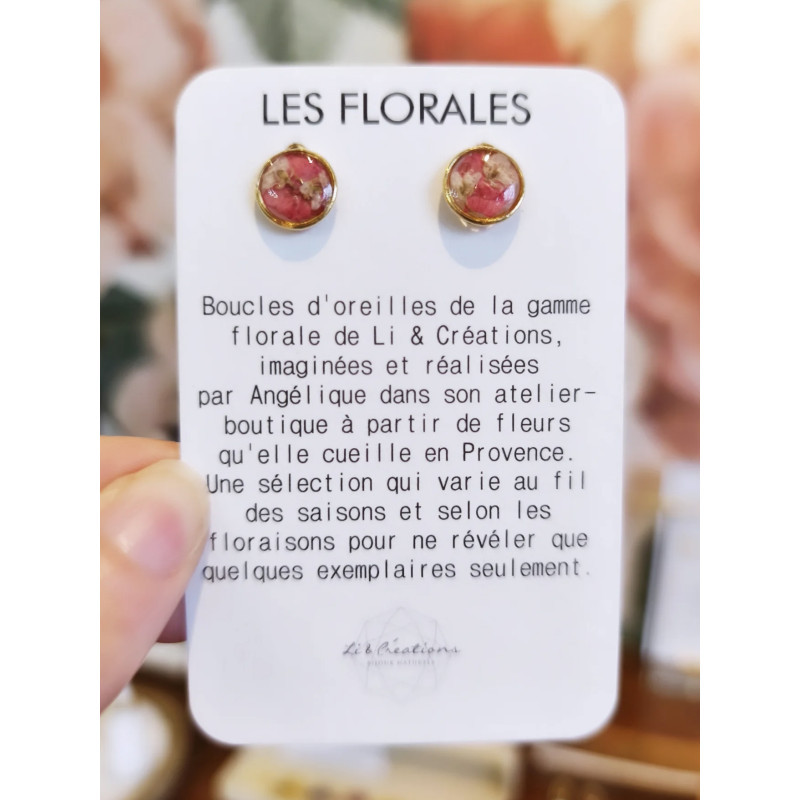 Boucles d'oreilles clous de la gamme florale, réalisées à partir d’un support en or gold filled 14k et ornées de pétales de roses roses et de fleurs blanches des champs cultivées et cueillies à la main en Provence par Angélique, la créatrice. Les compositions présentent dans ses bijoux sont naturelles et varient au fil des saisons, à l'allure des floraisons et selon ses cueillettes. Elles sont pétiolées, sessiles, entières, parfois dentées à nervures pennées ou palmées avec un certain nombre de nœuds, et sont triées, puis sélectionnées et reposées pendant plusieurs jours avant de prendre forme dans son atelier-boutique à Aix-en-Provence (13290). Pièce anti-allergène. Hauteur : 10 mm. Entretien : ne craint pas l’eau.