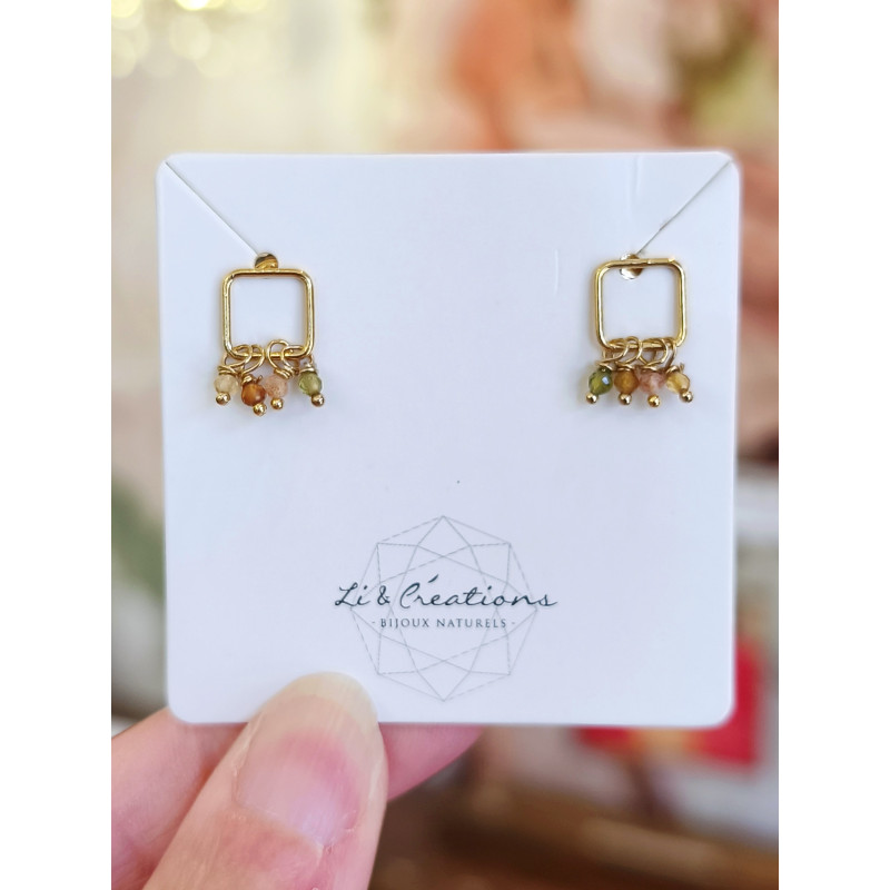 Boucles d'oreilles carrées de la gamme minérale, réalisées à partir de pierres fines naturelles et d'éléments en or gold filled 14k. Elles sont en tourmaline multicolore facettée, soigneusement sélectionnée et montée en bijou par Angélique, la créatrice, dans sont atelier-boutique à Aix-en-Provence (13290). Pièce anti-allergène. Hauteur : 12 mm. Entretien : ne craint pas l’eau.