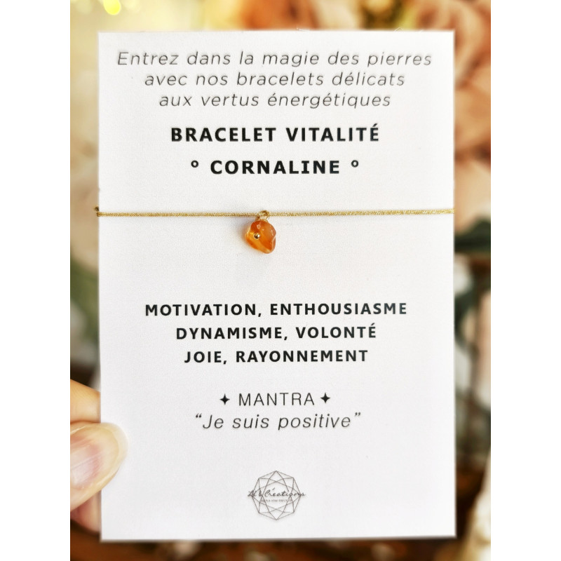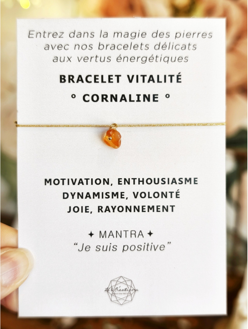 Bracelet de la gamme minérale, réalisé à la main par Angélique, la créatrice, à partir d’une pierre fine naturelle, d’un cordon doré clair et d’éléments en or gold filled 14K. Elle est en cornaline sélectionnée, pièce par pièce, et légèrement polie dans son atelier-boutique à Aix-en-Provence (13290). Bijou réglable, présenté sur son illustration porteuse d'un message aux intentions positives. Pièce anti-allergène. Entretien : ne craint pas l’eau.
