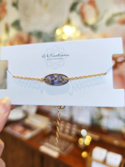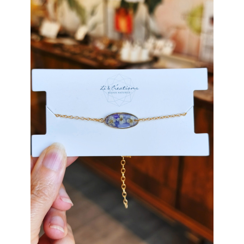 Bracelet de la gamme florale, réalisé à partir d’éléments en or gold filled 14k et orné de pétales de pensée bleue et de fleurs blanches des champs cultivées et cueillies à la main en Provence par Angélique, la créatrice.Les compositions présentent dans ses bijoux sont naturelles et varient au fil des saisons, à l'allure des floraisons et selon ses cueillettes. Elles sont pétiolées, sessiles, entières, parfois dentées à nervures pennées ou palmées avec un certain nombre de nœuds, et sont triées, puis sélectionnées et reposées pendant plusieurs jours avant de prendre forme dans son atelier-boutique à Aix-en-Provence (13290). Pièce anti-allergène. Entretien : ne craint pas l'eau, se range dans son pochon à l'abri de la lumière éclatante.